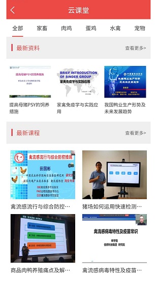 1、丰富资源:最新的资料课程提供。家畜、肉鸡、蛋鸡、宠物涉及多个养殖领域,一键查看了解更多的课程信息内容,养成每日学习好习惯。
