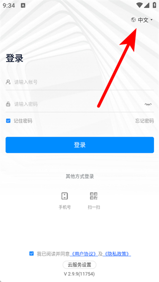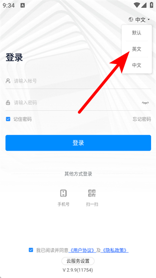 1、打开登录界面,点击右上角的中文,展开语言选项列表。