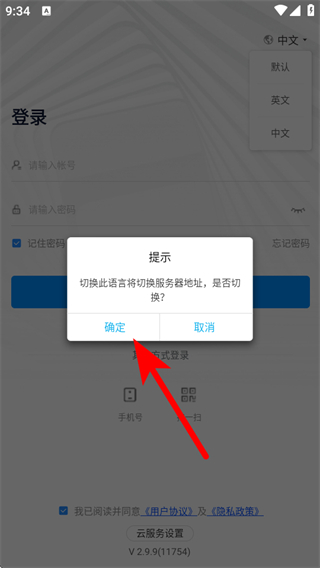 3、在弹出的提示框中,点击确定,完成英文模式的切换操作。