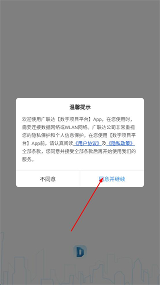 1、找到广联达数字项目平台温馨提示界面的同意并继续按钮,点击同意并继续。