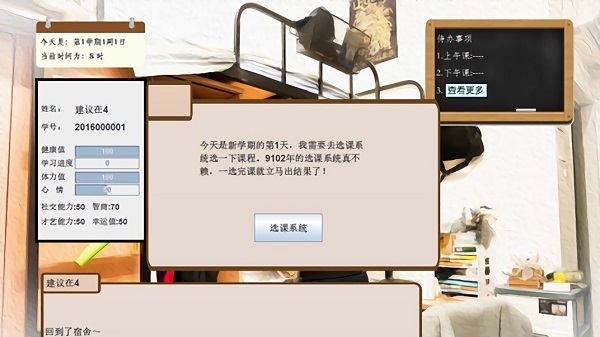 -选课:对清华的选课系统进行简单模拟。为了尽可能涵盖玩家的类型,我们选择了新雅书院作为主人公的院系,进而拓宽了选课的自由度;