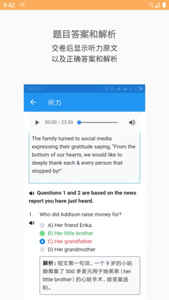 严格模拟考试:禁止长按查词,不可调整音频播放进度,播放结束后自动交卷。