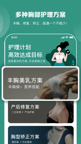 丰胸美乳、产后修复、胸型矫正、疏通排毒4种个性化方案选择,通过AI智能定制属于您的专属方案,从饮食建议、睡眠反馈、内衣穿戴建议、智能美胸记录等方面为您生成个性化方案!