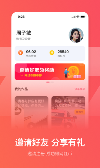 3、邀请好友,分享有礼,邀请注册,成功得网红币。