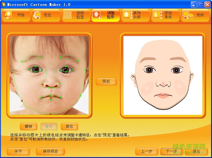 首先安装微软卡通秀,然后会出来微软卡通秀的界面,点击新建卡通,然后选择一张你要做的照片,调节绿框框住照片上的人脸,然后可以通过绿色路径商贸的点来调节脸型和五官形象!