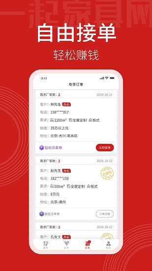 一起家具网商家版是一款专门为家居打造的手机商城购物应用软件。这里每天都有超多的优惠活动更新,质量保证绝对的放心。商家也可以直接在平台上接单,查看客户对家居的需求,很快为用户送货上门,提供最优质的售后服务。
