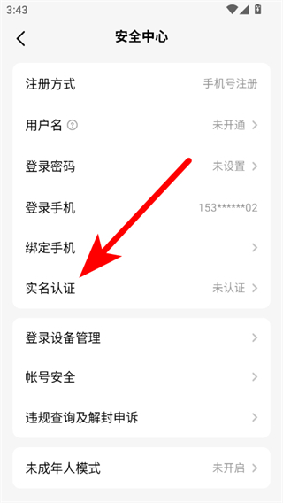 3、在安全中心页面点击实名认证,进入实名认证的填写身份资料页面。
