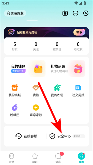 2、在个人页面点击安全中心,进入安全中心页面。
