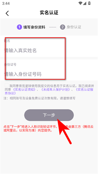 4、在填写身份资料页面输入真实姓名和身份证号码,勾选同意协议后点击下一步,即可完成音觅星球的实名认证流程。