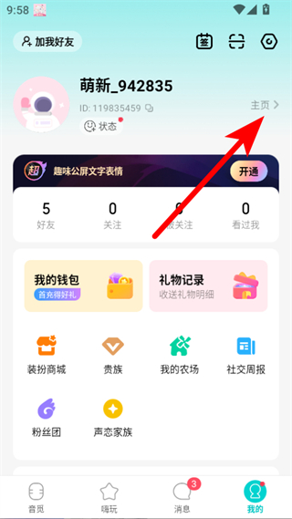 2、在个人页面中点击主页,进入个人主页界面。