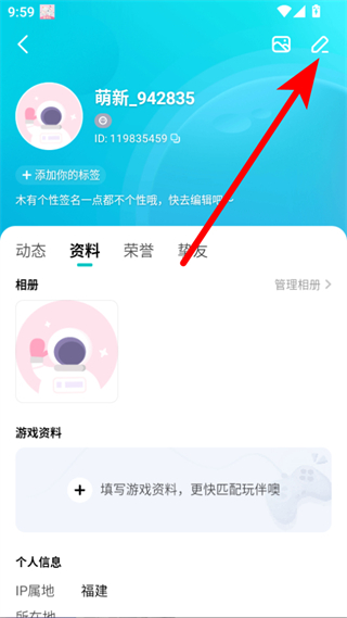 3、在个人主页界面中点击编辑图标,进入编辑个人资料界面。