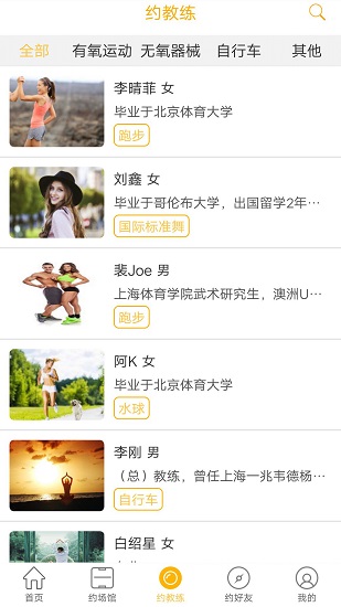 用户可以根据自己的爱好,快速找到适合自己的运动项目,还可以在线挑选教练,来对自己的运动进行指导。