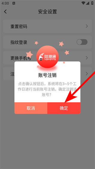 3、在账号注销提示框中,点击确定发起账号注销流程。