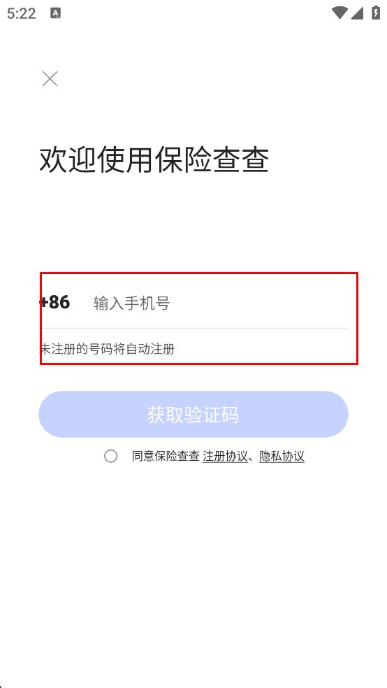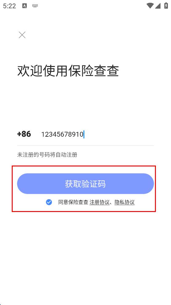 3、勾选同意保险查查注册协议、隐私协议,点击获取验证码。