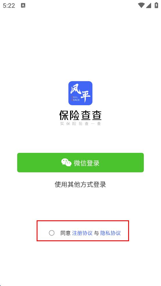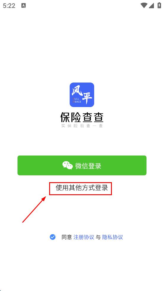 1、打开保险查查APP,勾选同意注册协议与隐私协议,点击使用其他方式登录。