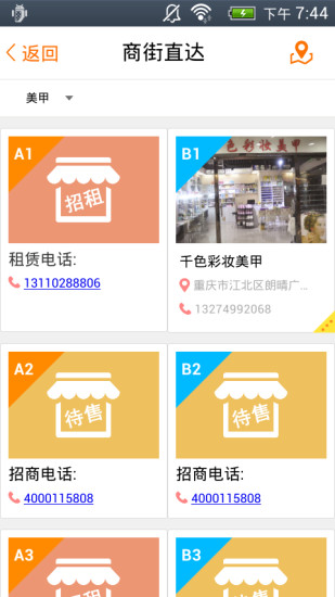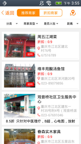 2、软件全面展示商家的信息,提供城市(区县)选择,行业类别选择;