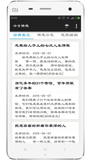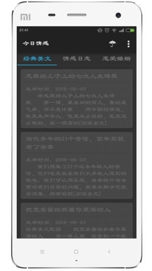 今日情感是一款新闻阅读类手机软件包含内容广泛,亲情、爱情、友情、人际交往中关系的处理,让你在这里找到情感的共鸣,简单的生活,幸福的生活。其实很多时候,幸福就在你的身边,只是缺少发现的眼睛,或者是缺少感觉神经。让我们用心体会,幸福很简单。喜爱的朋友赶快下载体验吧!