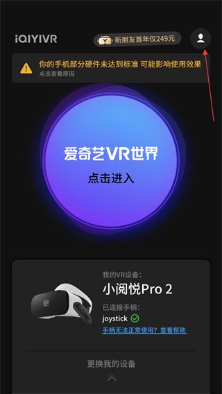 1、启动爱奇艺VRApp,在主界面找到并点击更换我的设备。