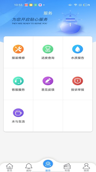 3、设置有很多的服务功能专区,包括报装维修、进度查询、水质报告、投诉举报等;