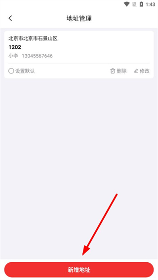 3、在地址管理页面,点击底部的新增地址按钮,进入新增地址填写界面。