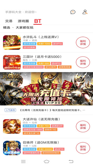 手游玩大全app为玩家提供手游交易和开局福利,包含bt手游、满级VIP、GM特权、免费首冲、0元畅玩等系列手游福利。