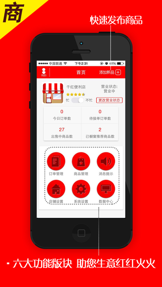 “千红便利商家”是一款为可提供即时性送货上门服务的便利店/超市店主量身定制的应用,通过它商家可以进行自助开店、商品发布及管理、处理客户订单、维系客户关系,千红在手,生意红红火火!