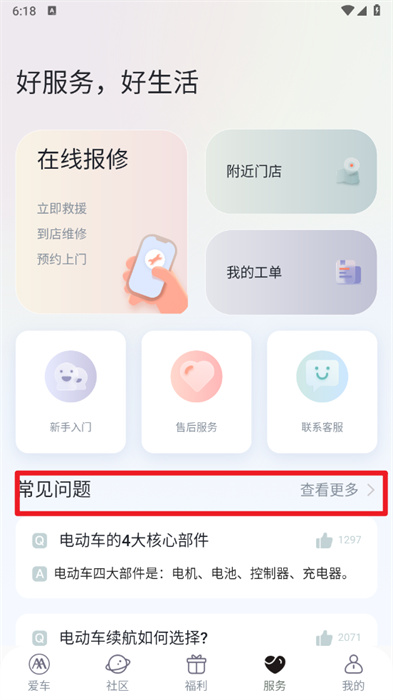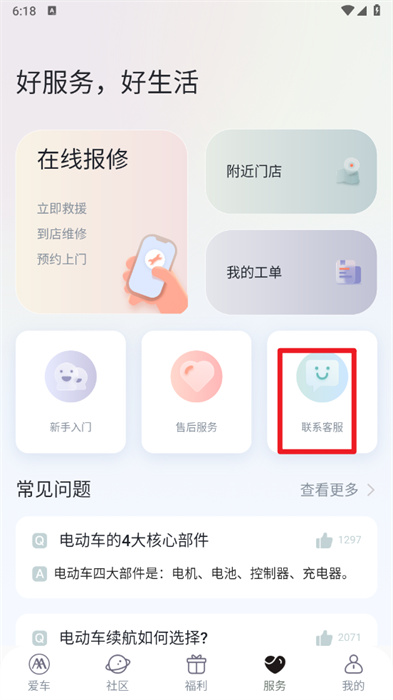 1、进入到应用之中后,用户可以点击服务栏的【在线报修】功能来进行爱车的报修;