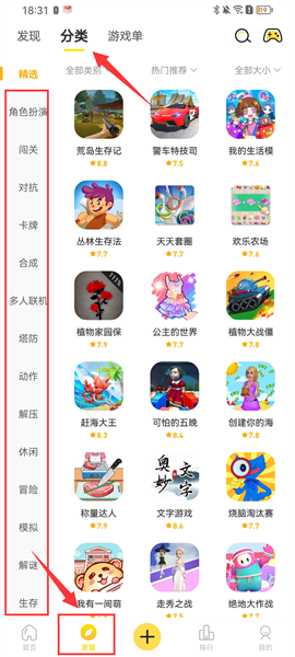 2、接着点击下方的“发现”,再点击“分类”,就能看见详细的游戏分类,便于大家快速的找到自己喜欢的游戏类型,也可以直接点击右上角的放大镜搜索标志,输入目标名称快速查找;