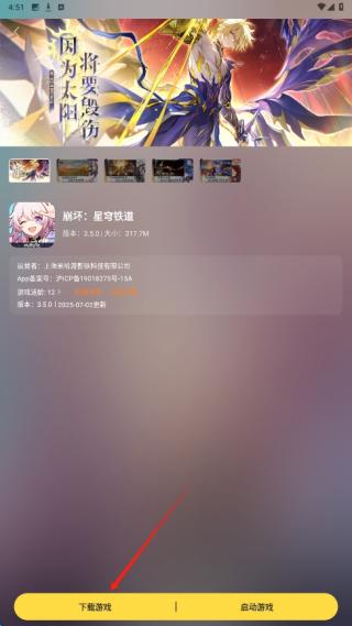 3、找到崩坏:星穹铁道游戏详情页,查看介绍后,点击底部黄色“下载游戏”按钮,开始获取该游戏。