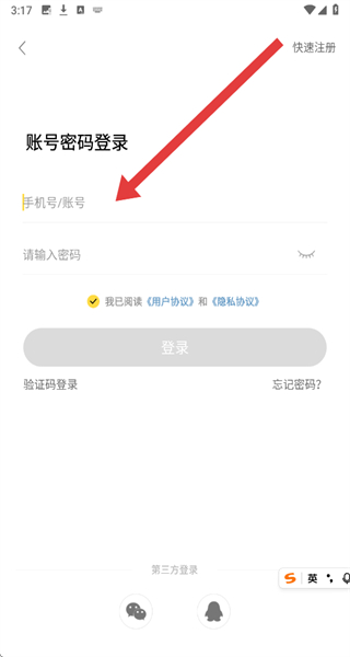 3、在进入到账号密码登录页面时,可以点击输入框依次填写账号和密码信息进行登录。