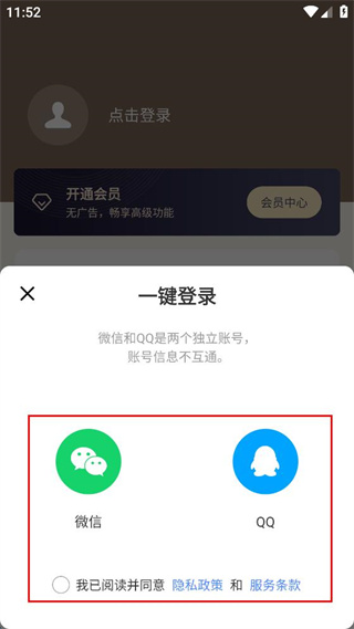 3、在一键登录窗口选择微信或QQ登录方式,勾选同意隐私政策和服务条款,完成登录。