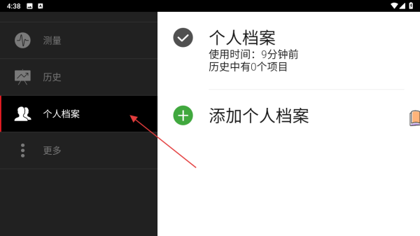 1、打开24小时心率监测仪应用,点击左侧菜单栏中的个人档案选项,进入个人档案管理界面,能看到使用时间和历史项目数量等信息,还可点击添加个人档案进行操作。