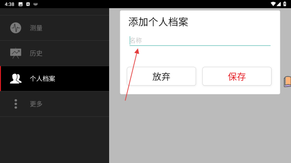 2、点击添加个人档案后,弹出添加窗口,在名称输入框中,输入要添加档案的名称,比如自己的名字或特定标识,输入完成后,点击保存按钮,即可完成基本档案信息录入。