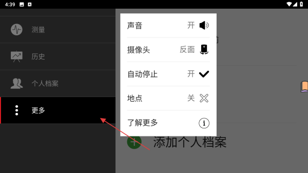 3、若需进一步设置档案相关参数,点击左侧菜单栏中的更多选项,在展开的设置项中,可对声音、摄像头、自动停止、地点等进行设置,完善个人档案的使用偏好。
