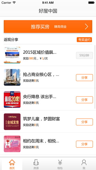 1、分享抢钱宝的楼盘活动至微信朋友圈或者新浪微博,可获返现奖励;