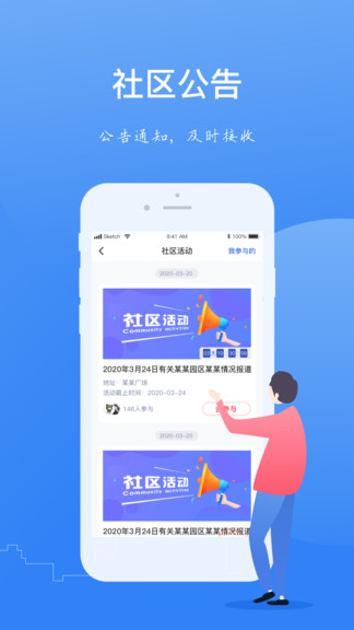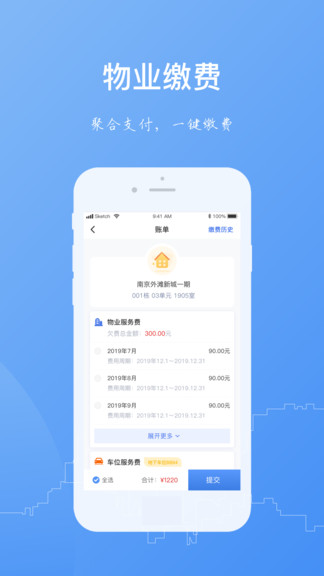 物业服务:手机开门、 物业缴费、公告查看、报修服务(此功能适用于合作小区)