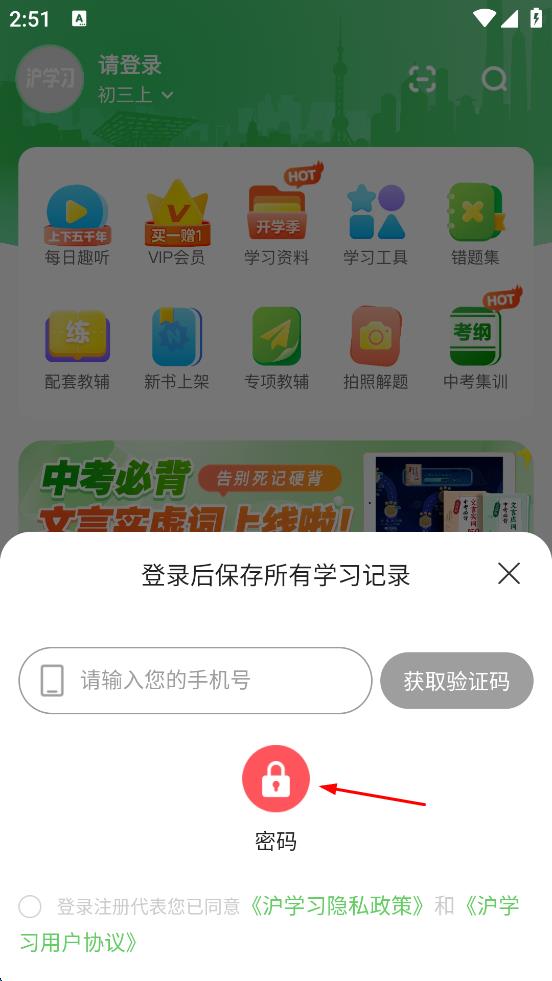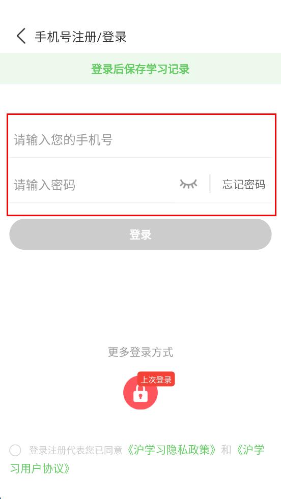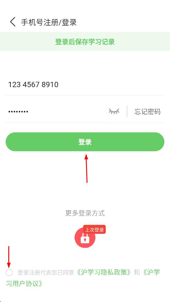 4、信息输入完成后,勾选“登录注册代表您已同意沪学习隐私政策和沪学习用户协议选项,然后点击“登录”按钮,完成账号登录。