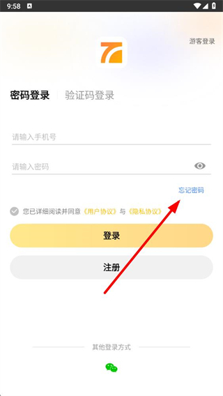 2、在密码登录模式下,点击忘记密码,进入忘记密码页面。
