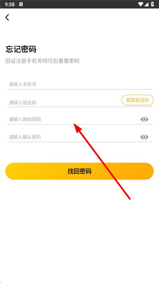 3、在页面输入手机号、验证码,设置新密码并确认,点击找回密码即可。