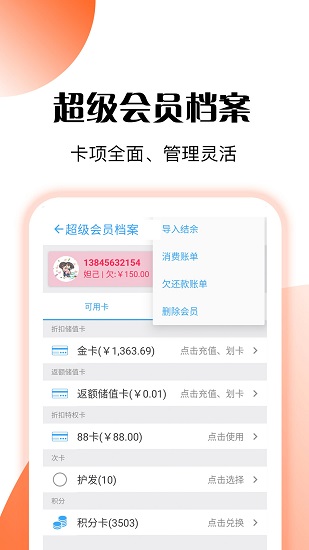 【高效节能】:免服务号申请,免卡制作,免设备,用手机就能管理店铺生意。