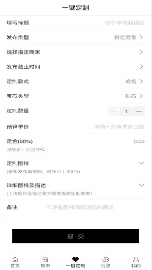 主要作为珠宝商家的信息发布平台,解决顾客珠宝定制需求。顾客可以通过手机app程序进行珠宝定制需求的任务发布,商家可根据顾客的珠宝定制信息进行款式设计、产品设计等等,并顾客可以通过联系商家信息进行线下沟通。