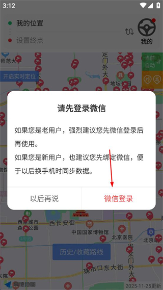 1、打开高德地图界面,点击右上角我的按钮,触发请先登录微信弹窗,提示老用户或新用户绑定微信。