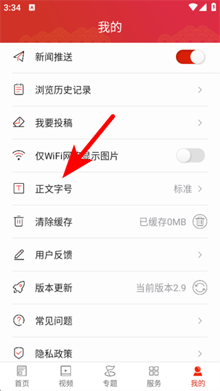 2、在我的个人页面里,需要点击正文字号,进入正文字号设置页面。