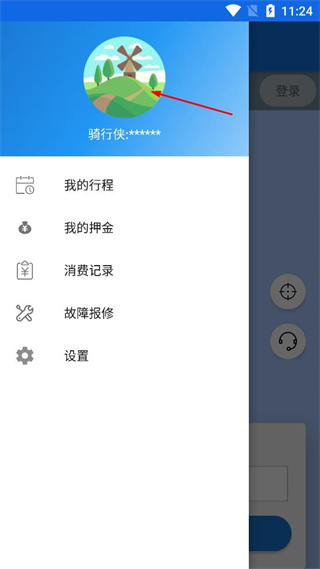 2、在展开的列表中,点击骑行侠对应的头像区域,进入账号登录的相关界面。