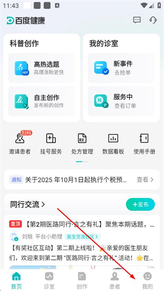 1、打开百度健康医生版APP,在首页点击底部导航栏的我的选项。