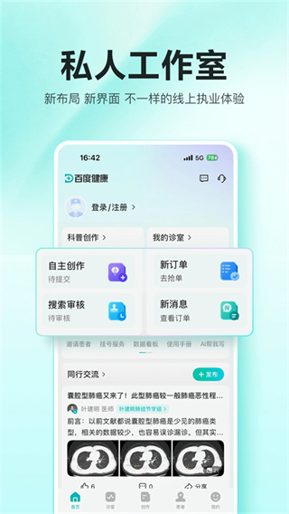 百度健康(医生版)是百度旗下专为医生提供服务的在线工作平台,依托于百度集团流量、技术、资源优势,全面提升医生个人品牌影响力,开启线上执业新方式,为更多患者提供专业服务。