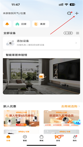 1、打开乐橙监控APP,在首页右上角点击+的图标。