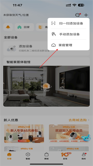 2、在弹出的菜单栏中,点击家庭管理的功能按钮。