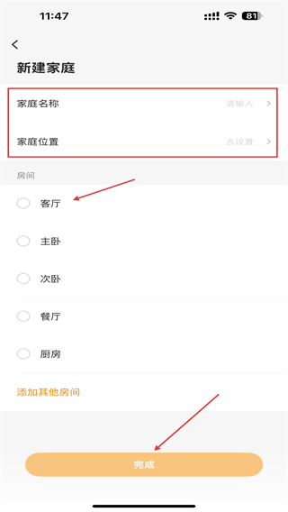 4、输入家庭名称、位置并点击客厅后,再点击完成的按钮即可。
