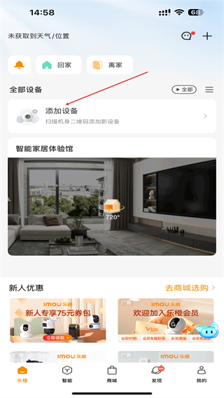 1、在乐橙主界面点击添加设备选项,进入设备添加的扫码页面。